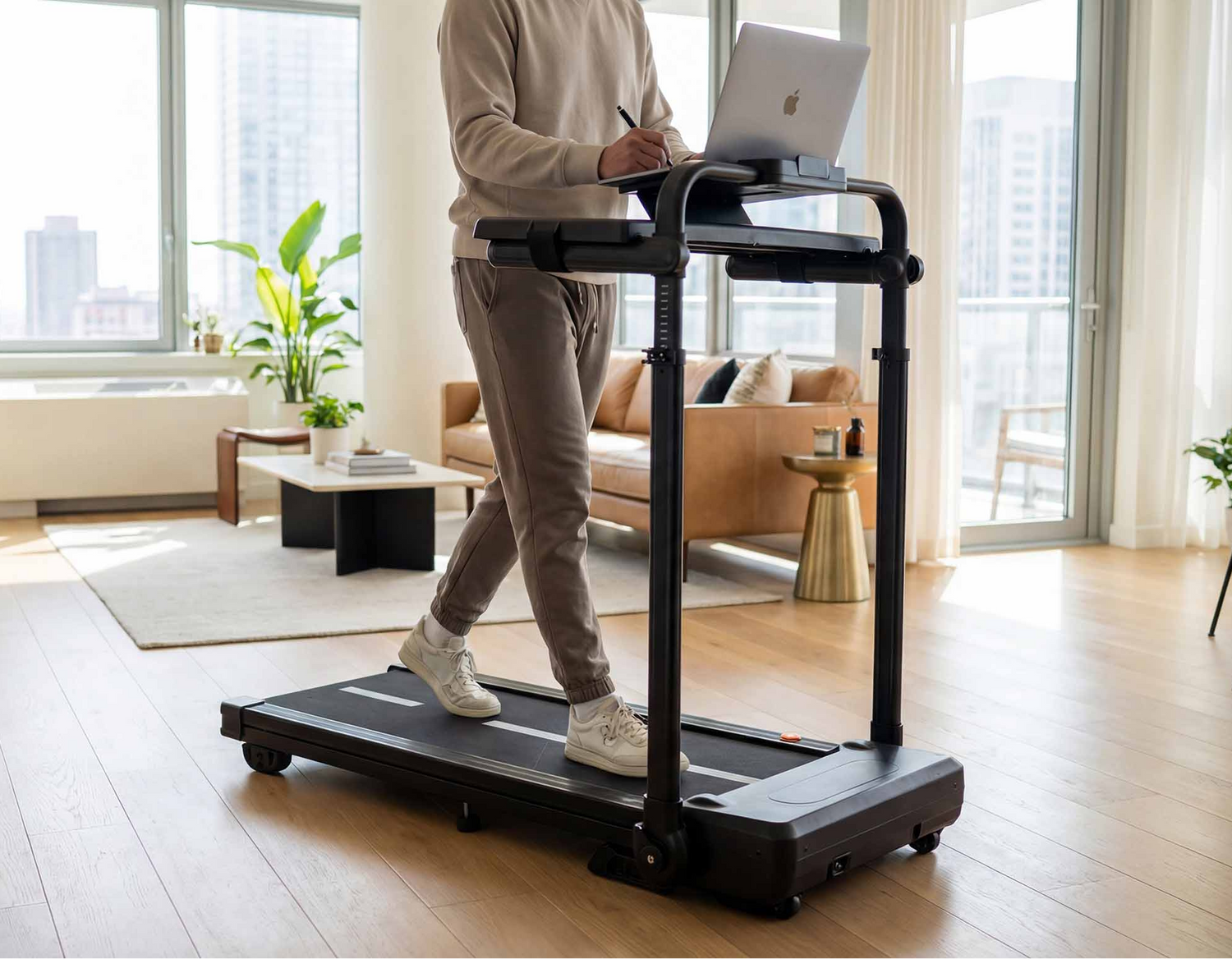 Od spokojnego spaceru podczas pracy zdalnej, po dynamiczne bieganie - bieżnia płynnie dostosuje się do Twojego rytmu w zakresie 1 - 12 km/h. Steruj prędkością za pomocą pilota, trzymając się stabilnej poręczy dla bezpieczeństwa. Idealna zarówno do całodniowego ruchu przy biurku, jak i do intensywniejszego treningu biegowego